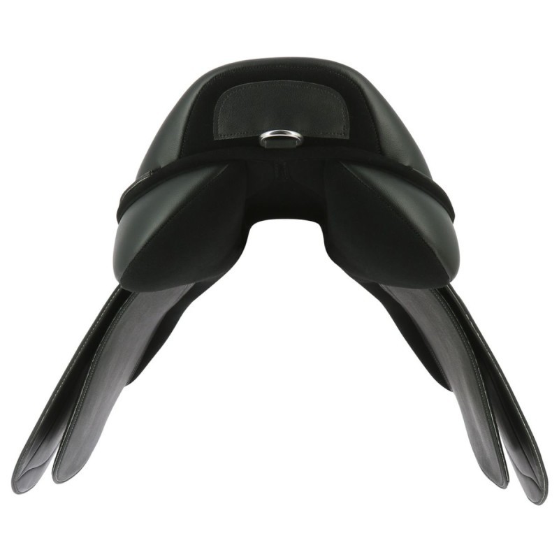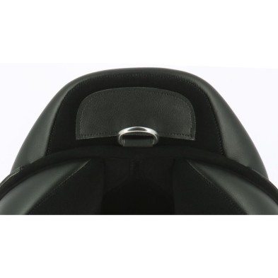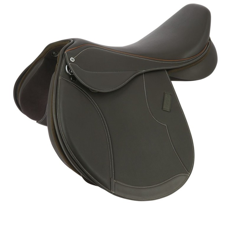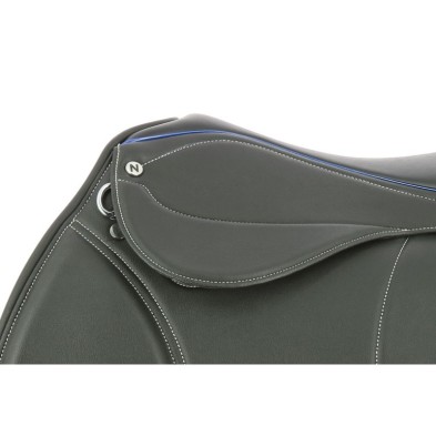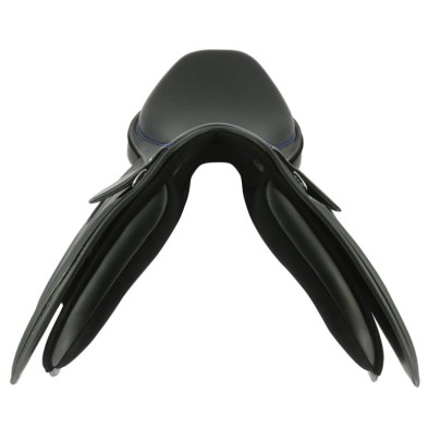 Silla de salto fabricada con material antideslizante de alta resistencia (cuero sintético, rexine, EVA y tejido sintético laminado). Asiento realzado de un ribete azul para la silla negra y naranja para la silla marrón. Faldón reforzado en la parte inferior. Armadura semihueca de plástico moldeado inyectado con arco de puente intercambiable para una perfecta adaptación a la cruz y a los hombros de su caballo. Equipada de serie con un arco de puente de talla media. Bastes rellenos de lana sintética y forrados de poliéster texturado. Plátanos delanteros intercambiables y reposicionables con tira de auto-agarre. Latiguillos reforzados de PVC montados en anillo. Parche montado en tira de auto-agarre en la parte trasera del borrén y anilla de baticola. Composición: polipropileno. .