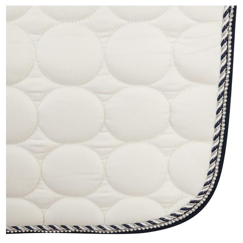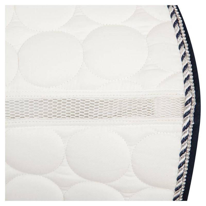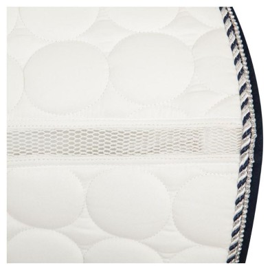 Esta sutil y elegante de algodón tiene un relleno de poliéster y una costura trasera para promover el flujo de aire. La mantilla tiene un relleno de polyfill de 300 g y espuma de 10 mm y está rematada con ribetes de cordón y cinta decorativa con rombos. Presenta un diseño circular y trabillas y correas de retención con cierres de velcro.