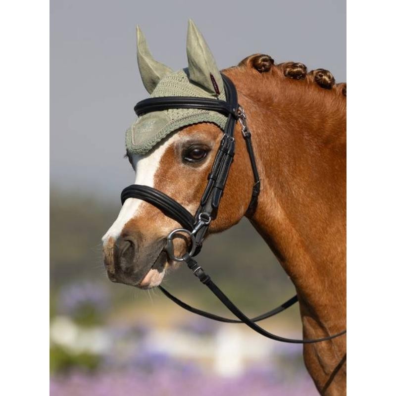 Mini LeMieux está destinado a atraer a jinetes menores de 12 años con buen ojo para el estilo. Especialmente diseñada para ponis de 1.10-1.30m de alzada, la Mini LeMieux Fly Hood está hecha a mano con dos estilos de crochet muy tejido con cómodas orejas de tela de alta densidad que suavizan el sonido y evitan que las moscas entren en sus oídos.