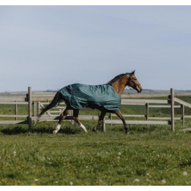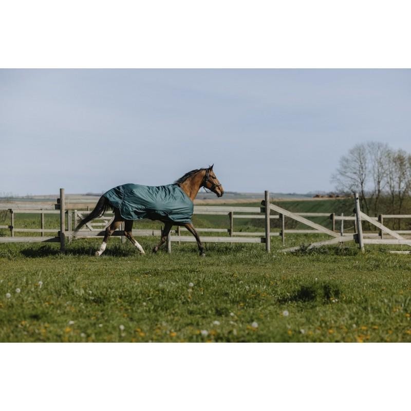 Manta de exterior impermeable y transpirable de poliéster Ripstop de 600 deniers con costuras termoselladas, forro de nylon. Equipada con un gran faldón de cola impermeable, almohadilla de borreguillo sintético en el cruz, cruces bajas ajustables y una correa trasera ajustable. Cierre del pecho con fijación rápida, reforzado con tiras de velcro. Cubrecuellos se vende por separado.