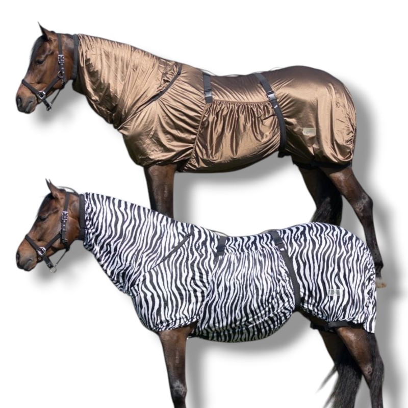 Esta manta para eczema cuenta con un cuello fijo con cierre elástico, una amplia solapa abdominal con cinchuelos elásticos ajustables y una amplia solapa trasera. La manta tiene cierres de plástico y un cierre entre las patas delanteras para fijar la solapa abdominal. Las investigaciones han demostrado que el estampado de cebra ahuyenta a las moscas debido a que las rayas reflejan la luz. Este reflejo irrita a los insectos.