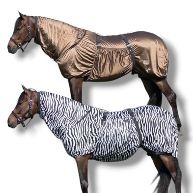 El uso de la manta impide el contacto de los insectos y evita que el caballo se rasque. Ayuda en caballos alérgicos. Protege contra los rayos del sol.