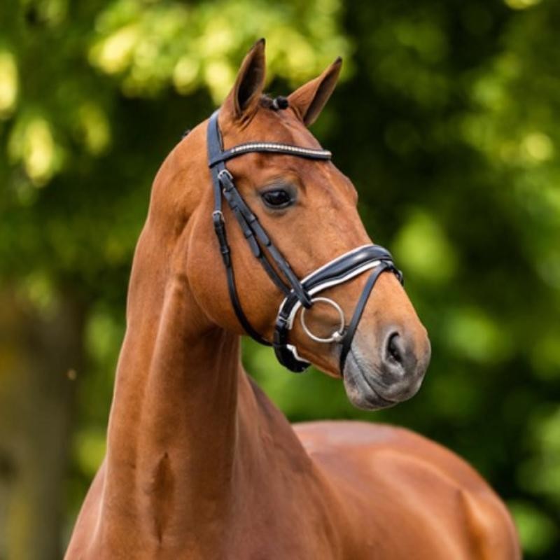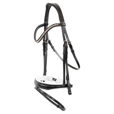La testera y la muserola son están suavemente acolchadas para ofrecer una comodidad óptima y tienen una forma anatómica que garantiza una buena distribución de la presión y un ajuste perfecto. La testera está incrustada con una cadena de lujosos cristales Stellux™ de oro rosa. Los cristales Stellux™ están completamente fijados, lo que los hace aún más seguros.