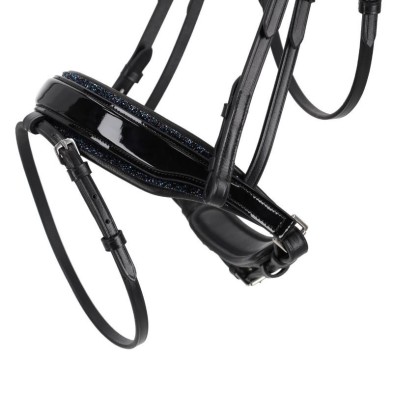 Cabezada anatómica con acolchado extraíble y frontalera intercambiable. El acolchado de la muserola, con detalles de charol y purpurina, es fácil de cambiar mediante un cierre de velcro. La frontalera, con piedras y detalles de purpurina, se puede cambiar fácilmente mediante botones a presión. La corona, suave y anatómica, con un corte, reduce la presión en el cuello.