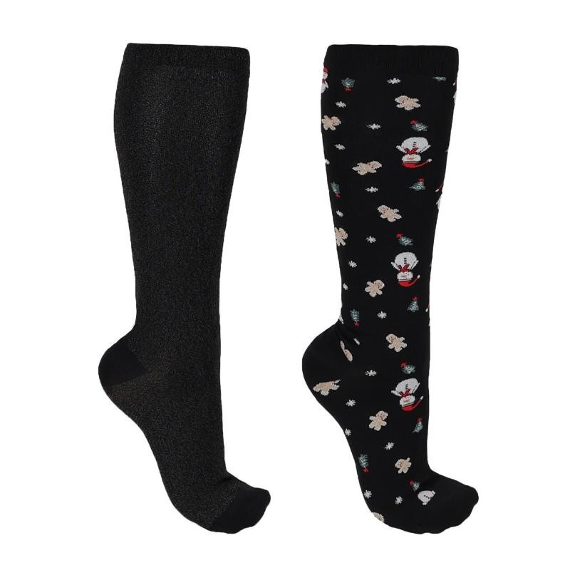 Dale un toque navideño a tu atuendo de equitación con este juego de dos pares de calcetines con un festivo estampado navideño y purpurina. Diseñados específicamente para jinetes, estos calcetines están confeccionados con tejido elástico para una comodidad óptima, tanto dentro como fuera de las botas de montar. ¡Combínalos con nuestros otros productos navideños a juego para un look navideño con estilo!