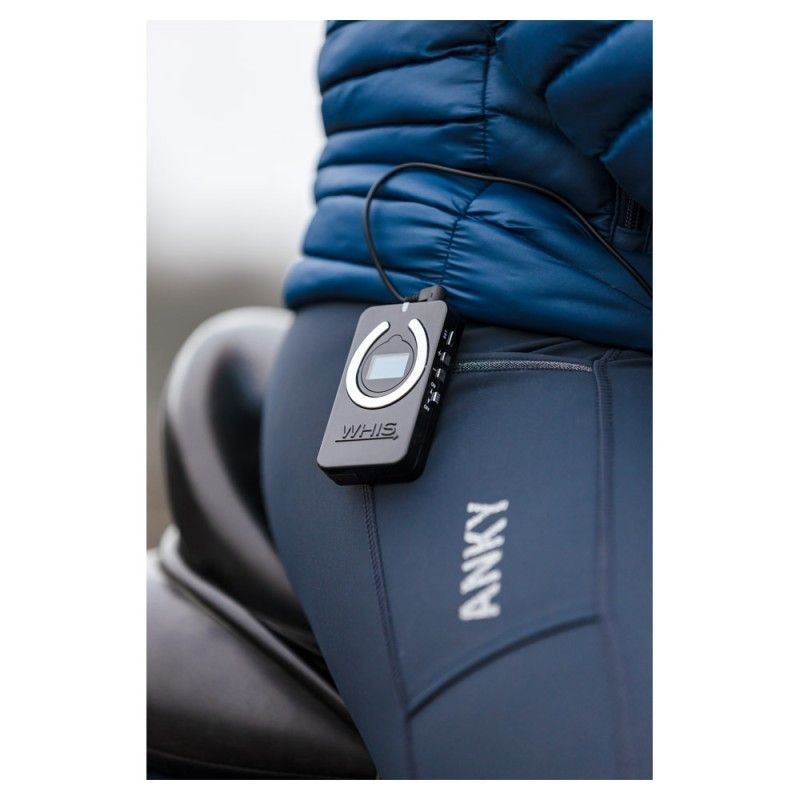 WHIS Competition es muy fácil de usar: solo tienes que encender el dispositivo. El alcance de WHIS Competition está garantizado en la práctica hasta 100 metros, lo que es más que suficiente para una pista de doma. La pantalla iluminada tiene un diseño único. Muestra el estado de la batería, la conectividad y el volumen. El WHIS Competition viene con batería recargable con 10 horas de duración, cargador y enchufe mundial. En resumen: hemos pensado en todo. WHIS Competition está listo para usar tan pronto como llegue en su estuche personalizado.