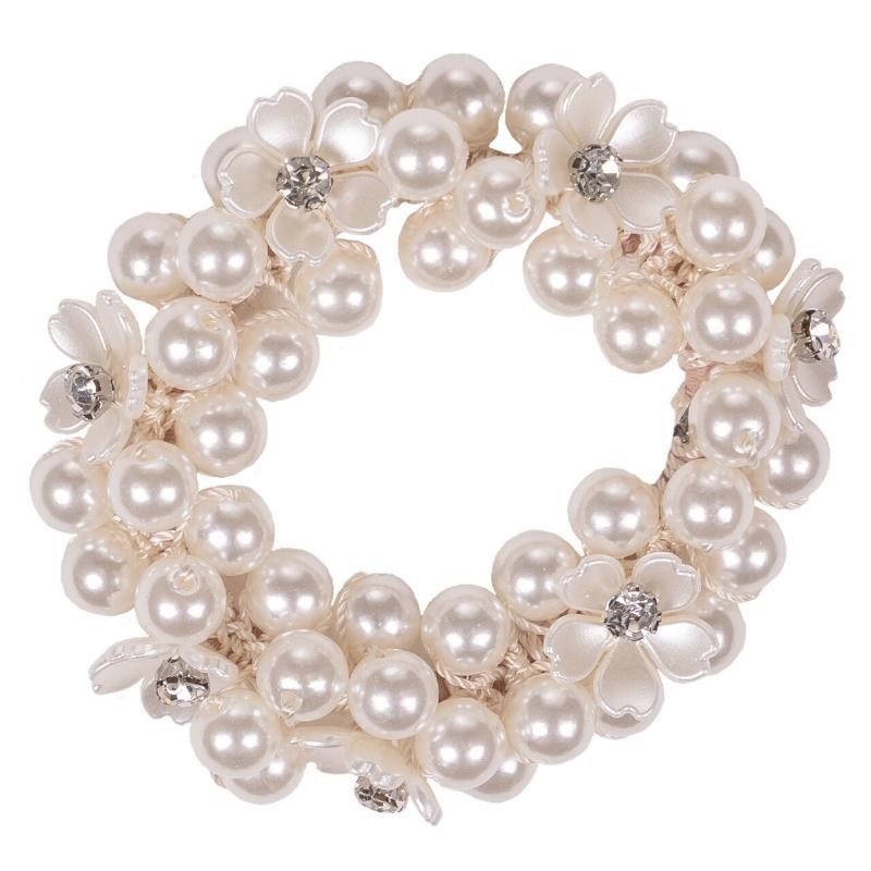 Coletero elástico con perlitas redondas y cuentas en forma de flor.