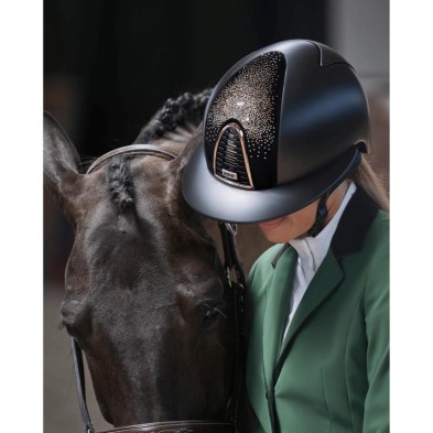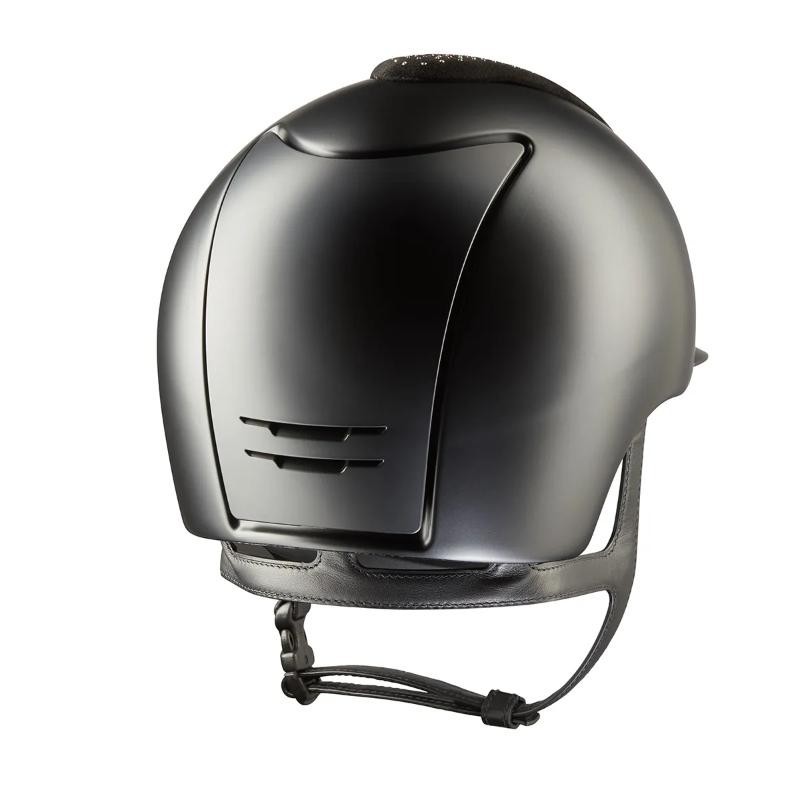 Diseñado y fabricado 100% en Italia. El modelo CROMO 2.0 es la evolución del casco Cromo. También éste se encuentra disponible en diversos acabados y colores variados, CROMO 2.0 permite al jinete acceder a más posibilidades de personalización de manera autónoma, incluso después de la compra. Tanto la pieza frontal y posterior como la visera pueden ser reemplazadas por el jinete mediante simples pasos, gracias a un innovador sistema mecánico de encaje. La calota externa, fabricada con policarbonato con sistema de moldura, combina la ligereza y la resistencia. La rejilla de aereación, a partir de un diseño agresivo y elegante, está disponible tanto con acabados a contraste como tono sobre tono. El sistema KEP AIR CONTROL SYSTEM se perfecciona con rendijas de aereación en la parte posterior, para garantizar una mayor transpirabilidad y el mejor control de la temperatura interna. La correa de cuero auténtico cosido artesanalmente a mano mantiene los cinco puntos de unión para una horma más estable. El nuevo relleno, aún más cómodo y transpirable, está elaborado con un suave tejido procedente de materias primas ecológicas. Puede retirarse y lavarse en cualquier momento a mano o en lavadora a 30°. Puedes hacer que tu casco sea único personalizándolo con hermosas aerografías a mano alzada u otras técnicas. CROMO 2.0 cuenta con un microchip integrado, ubicado bajo la pieza frontal, en la que se puede cargar la información sanitaria del jinete, después de haber descargado la aplicación de KEP. En caso de necesidad, ayudará a hacer más rápidas las intervenciones de primeros auxilios. Junto a cada casco se proporciona también la visera modela jockey. Peso: 500 gr. talla M - 535 gr. talla L