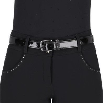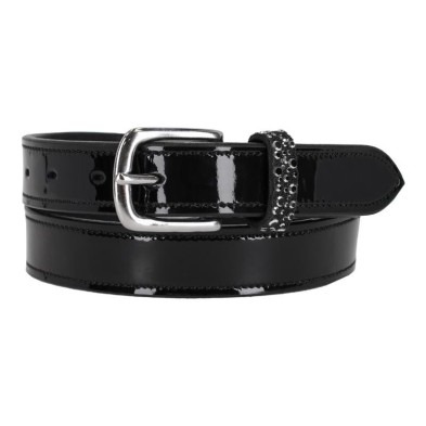 El cinturón Lagos es un cinturón de charol con hebilla de acero inoxidable plateado. El cinturón incluye un pasador fijo adornado con pedrería grande y pequeña.