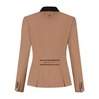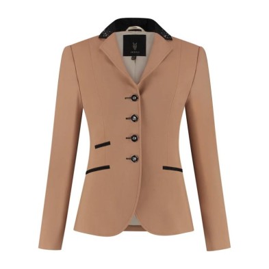Entra en la pista con confianza con «Caramel», una chaqueta de competición de lujo en color beige diseñada para jinetes y mujeres que buscan elegancia, rendimiento y un toque femenino.