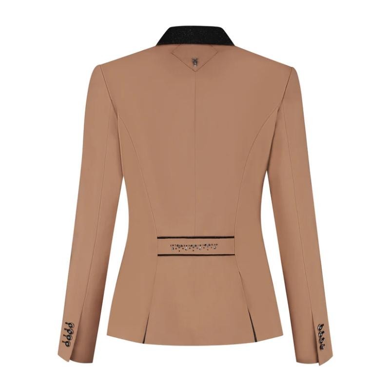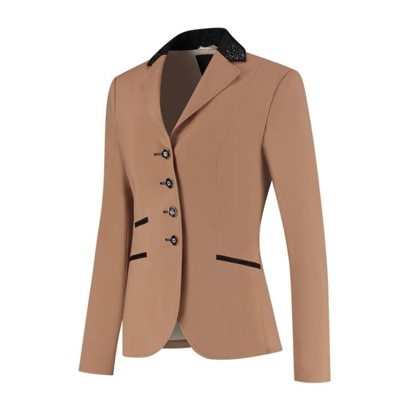 La base beige se realza con toques de purpurina negra, refinados detalles en oro rosa y un acabado con brillantes cristales Swarovski. Perfecta para doma clásica, salto o cualquier disciplina, esta chaqueta de competición para mujer te garantiza un look impresionante.